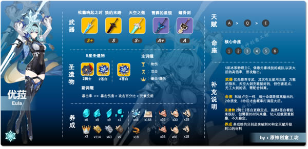 优菈的命座提升很大,每一命都能提高一段输出,2命属于质变,4命提高核爆伤害。6命能够享受极高倍率的大招,但由于优菈强度不算特别强,如果指望有璃月3C那样的输出,就最好别抽了。 XP党:抽爆好吧,强度重要?哪有老婆香~ 零氪,月卡党:不太建议抽,强度很有限,如果缺少主C的话,可以选择抽一个,但如果不缺少主C,还是留着抽之后的卡池吧。毕竟铁打的辅助,流水的C。何况是优菈这种强度不算很高的C。 氪佬: 看自己情况抽取吧。 圣遗物优菈的圣遗物;2骑士+2苍白,或者4苍白都可以,各有各的好处。 2骑士+2苍白:优点:稳定;缺点:上限不如4苍白 4苍白:上限高,但有一个缺点,就是需要在场8秒才能把被动叠满,享受到的效果是,比2+2多18%攻击(相当于多2角斗士套装)。但如果优菈没2命,那么一个长按元素战技,就会让被动进入真空期。 空之杯:物伤杯 理之冠:暴击/爆伤 时之沙:攻击力 副属性则是主C都需要的暴击爆伤和大攻击~ 武器五星武器:优先选择专武,无专武的话,狼末也是个不错的选择。天空可以加快大招充能(由于白字属性高,还是比4星好的),无工大剑配合钟离不比狼末差(甚至更强)。 四星武器:雪葬的星银(副属性物伤是真的香)> 螭骨剑 >= 试作古华 阵容