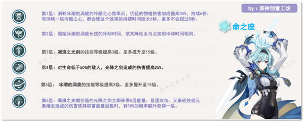 普通攻击: 为主要输出手段,十分建议优先升级,因为大多数时间都在用普攻来打输出。普攻为五段攻击,因此倍率比四段的雷泽稍微低点,但打出一套普攻的速度和不开大的雷泽差不了多少。 元素战技: 元素战技伤害不高,因为元素战技是唯一的冰伤,而优菈的大部分加成都是物理加成,因此,不指望用元素战技来打伤害。但提高元素战技可以提升长按的减抗,因此,还是有必要提升元素战技等级的。 特殊机制:冷酷之心:点按元素战技或者开大获得,长按消耗冷酷之心,如果有冷酷之心长按元素战技,会触发减冰抗和物抗,如果有两层,还会额外打出来一段倍率很高的物理伤害(和大招等级有关)。 元素爆发: 元素爆发倍率极高,由2段加成,一段为基础倍率,一段为蓄力倍率,在大招蓄力的7秒内,普攻或释放元素战技,都会提高一层蓄力倍率,最高30层(但如果没满命,一般也就十几层、甚至十层左右),大招需要80点能量,需要充能好久。也是一个极大的缺点。 开大后会刷新元素战技以及获得一层冷酷之心,不要浪费了。 生活技能: 合成角色天赋材料,10%概率双倍。根据计算,使用行秋的话,提高收益为8.3%,而用优菈则为10%。(其实和阿贝多同理) 天赋优先级 A > Q > E 命之座与抽取