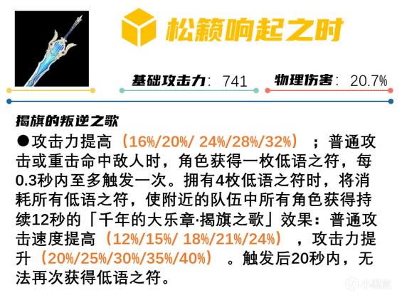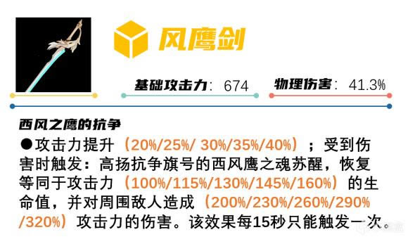 分析: 副词条为物伤加成,使得松籁作为输出向武器时更加偏向于物理输出,但由于主词条741点基础攻击力加成位列全武器之最,以及武器特效的攻击力攻速加成,使得其通用性也毫不逊色。唯一的缺陷是武器本身不提供任何双爆,在角色本身突破不增加双爆的情况下,对圣遗物有着更高的毕业要求。武器效果触发时有着36%攻击力加成以及12%的攻速加成,加成效果相对于其他五星武器而言中规中举,但由于此效果可作用于全队,有着一定的辅助性。正所谓铁打的辅助流水的C,这一辅助性质使得其具有更长久的保值性。 ▋风鹰剑