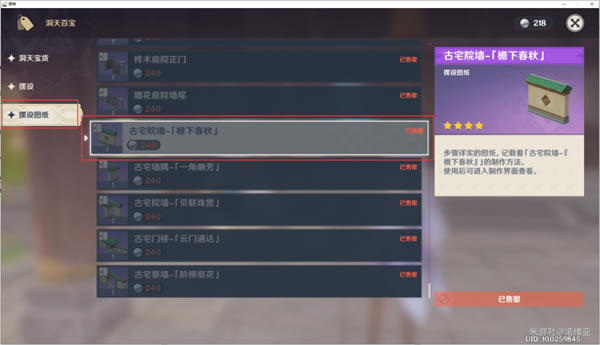 洞天百宝购买推荐洞天百宝中有三个类型的商品: 1.洞天宝货(7天更新)、2.摆设(24h更新、3.摆设图纸(一次性,版本更新可能增加新图纸) 购买推荐: 1.每天优先购买 仙速瓶 5个(每天更新) 2.图纸先买一个 围墙(古宅院墙-「檐下春秋」) 原因是 围墙的负荷低,前期加洞天仙力价格比高 然后 优先推荐 从紫色的到蓝再到绿图纸 的顺序购买 3.松木折屏-「云来帆影」这个是第一回的洞天宝鉴中,收集100个洞天宝钱送的 4.石狮子像-「百解」 这个是是第三回的洞天宝鉴中,放置三个不同摆设套装送的 因为紫**纸制作时间比较长,用仙速瓶比较划算一点,所以推荐一下, 到后期做套装的话,就缺哪个做那个就好了 注:80洞天宝钱对就30信任度,换哪一个都是一样的,不用纠结信任度问题~ 绿图纸:80洞天宝钱,首次制作信任度加30,制作所需时间12小时 蓝图纸:160洞天宝钱,首次制作信任度加60,制作所需时间14小时 紫**纸:240洞天宝钱,首次制作信任度加90,制作所需时间16小时 仙速瓶:每天必买
