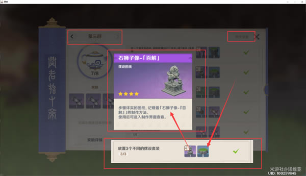 石狮子像-「百解」 这个是是第三回的洞天宝鉴中,放置三个不同摆设套装送的(套装在后面有提) 第三回的洞天宝鉴中,后继收集5000洞天宝钱,任务中会给另一个石狮子的设计图~加的洞天仙力和负荷是一样的,只是样式不一样~~~