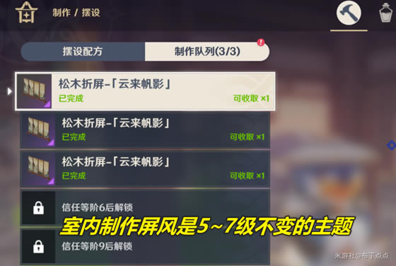 等到后期开始制造蓝**纸,信任值增幅缩水,但仙力增幅可以依靠继续“秒造”、“慢造”11个紫色摆设,保持每日900+的仙力增加,直到场景负荷到顶。 ▼上一篇攻略的【摆设 负荷比】详表,再给大家发一次▼
