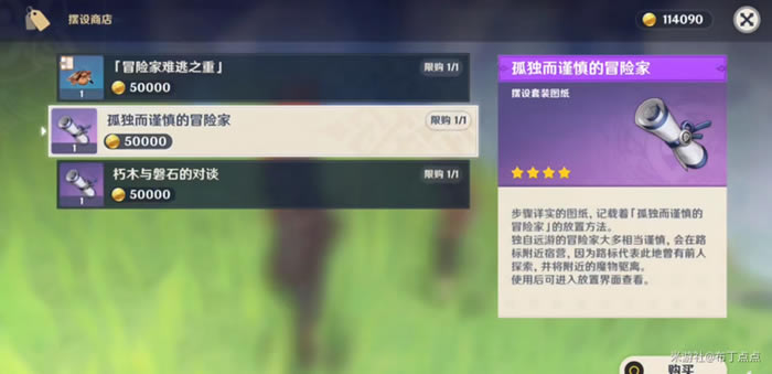 B,NPC【摆设商店】,每份图纸需要3w~5w摩拉不等。目前有2个NPC负责卖图纸,一个是蒙德城的歌德(教堂附近小花园的老头,白天出现),另一个是轻策庄的路爷(水车附近茅草房),买之前要准备15w+18w共33万摩拉才够用。