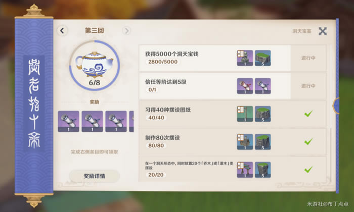 C,【洞天宝鉴】升级后的奖励。如下图所示,洞天宝鉴类似于大世界的【冒险之证】,里面有分支和全部达成的奖励。
