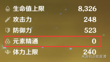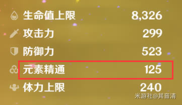 这里我选择的是练度较低且没有配置圣遗物的荧妹,触发菲谢尔精炼二阶的终末弓效果后,荧妹元素精通部分数值上升到125;