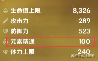 此使切换成队伍中的迪奥娜来触发终末弓效果,可以看到元素精通部分数值下降到了100;