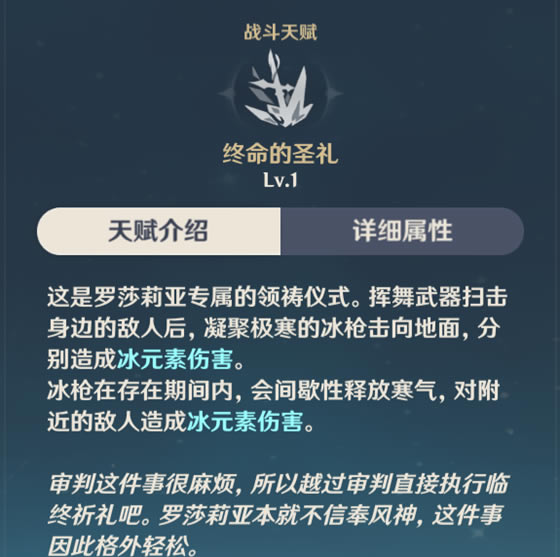 《原神》是由上海米哈游网络科技股份有限公司制作发行的一款开放世界冒险游戏,于2017年1月底立项,原初测试于2019年6月21日开启,再临测试于2020年3月19日开启,启程测试于2020年6月11日开启,PC版技术性开放测试于9月15日开启,公测于2020年9月28日开启。 原神中罗莎莉亚天赋是很多玩家关注的重点,本次就为大家带来了原神罗莎莉亚天赋详解与使用教学,非常全面的内容,想了解的朋友可以参考,希望能帮到大家。 罗莎莉亚天赋详解与使用教学普攻天赋值得注意的就是施放重击时记得要用方向键调整突刺位置,我发现贴身突刺后离得较远会继续向前突刺而非锁定怪突刺回去,直接突刺跑路了。 元素战技天赋:可快速位移,并造成冰元素伤害,冷却为6秒。快乐E闪,由于太快乐了导致削弱不能转移到体型较大的敌人身后,不然就是又一个跟班尼特一样的超四星角色。怪快打中的时候一个E闪开,然后又一个突刺回来,反复横跳。