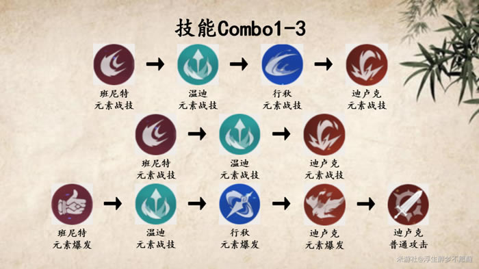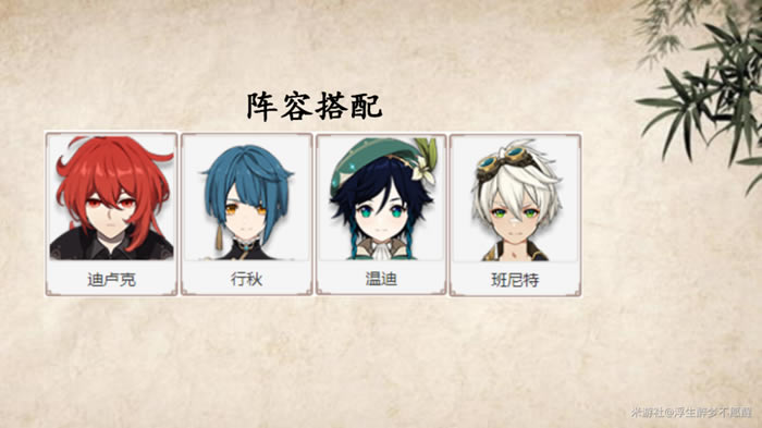 阵容介绍行秋的后台上水能力强,能辅助迪卢克打出高频蒸发。温迪聚怪。班尼特增伤、回复。班尼特与风套温迪配合减抗。 PS:关于温迪元素爆发时,迪卢克无法配合输出的问题,在该阵容里,温迪元素爆发负责的是普通小怪,这些可以全权交给温迪,温迪自身伤害不俗。 阵容优点 该阵容能够比较快速地处理大多数的战斗情况。且操作简单。 阵容缺点 (缺点多是因为将少数情况都详细列举出来了) 面对高火元素抗性的怪物(炽热骗骗花、爆炎树)输出下降,但因为有着风套40%的减对应抗性,还算可以;面对水元素护盾(水深渊法师),因为有迪卢克和班尼特两名火系角色,且元素战技都可以多次破盾,CD不长,所以破除水元素护盾的效率也还算过得去。 难以处理火元素免疫的怪物(火史莱姆、声望任务中拥有火元素免疫的怪物)、有着飞行能力的远程怪物(飞萤、纯水精灵凝聚的鸟)和水/雷元素增幅(愚人众先遣队·水统重卫士、愚人众先遣队·雷锤前锋军) 技能ComboPS:技能Combo为理想输出手法,实战请灵活应对