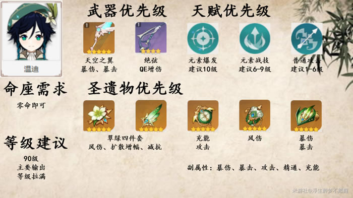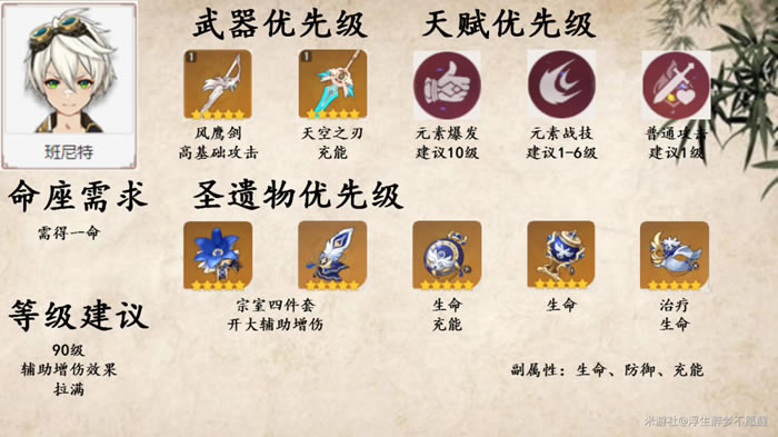 需得一命!需得一命!需得一命!重要的事情说三遍,不然难以发挥辅助增伤效果 班尼特的主要定位是回复,所以建议替代角色:琴(双风)、迪奥娜(六命增伤,触发有一定条件)、七七、芭芭拉 角色获取建议迪卢克:在抽取其他喜欢的五星限定角色的时候顺带获取 行秋、班尼特:可以在抽取其他喜欢的五星限定角色的时候顺带获取,也可以当其UP时尝试获取 温迪:当其UP时获取 普池的东西限定歪着歪着就有了 总之,原石优先限定角色池,非土豪不碰普池 武器获取建议在保证能获得喜欢的五星限定角色的前提下,当所需武器UP时尝试获取 圣遗物选择建议前期 迪卢克、行秋、温迪可以选择攻击杯,理之冠攻击力优先,其他主属性选择与后期相同 花、羽负责搭凑套装效果(随便的套装效果,尽量有用即可)不看副属性。前期有啥用啥,不建议去刷圣遗物本 中期 建议解锁圣遗物本最高难度时开始刷,时之沙、空之杯和理之冠主属性合适并凑出对应套装,不必非要全五星,不看副属性 获取优先级:迪卢克、温迪、行秋、班尼特 后期第一阶段(这才是圣遗物真正的开始...),圣遗物全五星(行秋、班尼特并非必要),其他与中期相同 后期第二阶段(该阶段是永远...),为迪卢克堆叠双暴 关于如何避免错过圣遗物 不论套装,不管时之沙、空之杯和理之冠的主属性,尝试所有五星圣遗物的双暴高值可能并保留 若是常用(包括花、羽、攻击/充能沙、元素/物理杯、暴伤/暴击头)或需要,则有双暴就保留,直到有足够多更好的,逐步提高标准 若不常用也不需要,歪一次就放弃,全中即保留 本次分享游戏《原神》攻略。 |