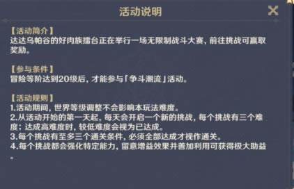 《原神》是由上海米哈游网络科技股份有限公司制作发行的一款开放世界冒险游戏,于2017年1月底立项,原初测试于2019年6月21日开启,再临测试于2020年3月19日开启,启程测试于2020年6月11日开启,PC版技术性开放测试于9月15日开启,公测于2020年9月28日开启。 原神中争斗潮流是很多玩家关注的重点,本次就为大家带来了原神争斗潮流攻略大全,也是强者的擂台玩法指南,非常全面的内容,想了解的朋友可以参考,希望能帮到大家。 争斗潮流攻略