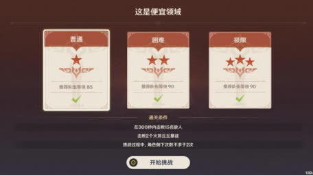 上方阔以选择难度,下方为所选难度的挑战成功条件。旅行者们阔以根据自己的情况进行相对应难度的挑战。 ps:如果有能力的旅行者阔以直接挑战极限难度哟~一次挑战,阔以把奖励拿满,有木有赚到? 但是,xiaoba还是建议,先挑战一次低级难度,熟悉一下机制为好哟~ (2)开始挑战时:
