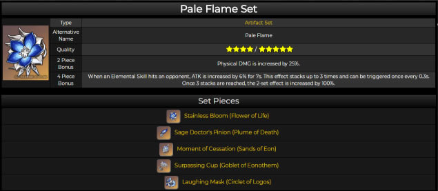苍白之焰,2件套+25%物伤,4件套效果: 释放元素战技获得6%攻击力加成,最多叠加3层,每0.3s最多触发一次,持续7秒 叠满后2件套效果翻倍