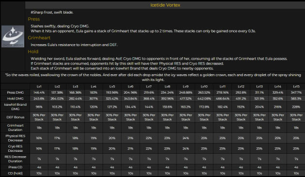 E元素战技,冰潮旋风(鬼知道官方咋翻译,总比这个更有诗意吧= =) 点按: 进行一次快速挥砍,造成冰元素伤害。如果命中了目标,优菈将会获得一层“冷酷之心”效果,最多两层。最多每0.3秒获得一层(祭礼大剑?) 冷酷之心: 提升优菈的防御力和抗打断能力 长按: 挥舞她的锋刃,向前斩击 ,对前方敌人造成冰元素范围伤害,并消耗所有“冷酷之心”层数。消耗“冷酷之心”,将会让被此技能命中的敌人冰抗物抗下降。每层“冷酷之心”都会转化成“旋冰刻印”对附近敌人造成冰元素伤害 思路来了,AAAAAEAAAAAEAAAAA长按E,倍率过会也会用到