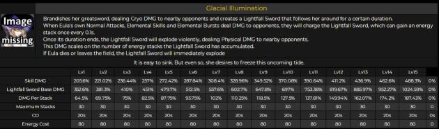 冰川光剑(公主飞溅) 优菈挥舞她的大剑,对周围敌人造成冰元素伤害(倍率不高,和甘雨二段差不多),并以她为中心召唤一个“光降之剑”,优菈自己的普通攻击,元素战技,元素爆发在造成伤害时,都会为光降之剑充能,最多每0.1s进行一次充能,最多30层。(约6s?)持续时间结束后,光降之剑会爆炸并对周围敌人造成物理伤害(倍率相当高,有尼玛3000%多????),伤害取决于光降之剑的充能层数。如果优菈退场或倒地,那么光降之剑会立即爆炸。 显然是物伤爆炸的倍率高,那么优菈就应该是Q起手,再进行AE连招