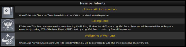 被动天赋: 1.合成天赋书有10%概率2倍产出 2.如果2层冷酷之心被长按E消耗,那么将会同时创造出一个“光降之剑的碎片”,碎片会立即爆炸,并对周围敌人造成正版光降之剑基础物理伤害值50%的物理伤害 3.优菈的普通攻击产生暴击时,E技能CD将减少0.3秒,这个效果每0.1秒至多触发一次 (那些每0.1s只能触发一次的意思就是普攻一套总共只能触发5次,因为中间有几段是造成2次伤害的)