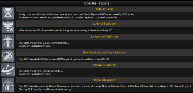 命座: 1命:消耗E技能产生的“冷酷之心”将使优菈获得30%物伤加成,每层“冷酷之心”将使这个效果持续时间延长6s,最多延长至18s 2命:长按E的CD变成4s 3命:Q+3 4命:光降之刃对生命低于50%以下的敌人造成的伤害提高30% 5命:E+3 6命:光降之刃的充能将从5层开始计算,普通攻击、E、Q将有50%几率获得额外一层光降之仍充能 1命提升堪比甘雨1命,起飞,2,4,6也是层层递进,但看不出哪个命座是像甘雨魈胡桃那样6命飞跃的,总之每个命座都有用,设计上还可以