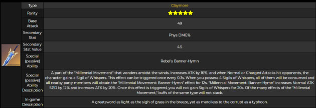 松籁响起之时(精1) 90级基础物理攻击741 物理伤害加成20.7% 被动[揭旗的叛逆之歌] 攻击力提升16% 普通攻击或重击命中敌人时,角色获得一枚“低语之符”,最多每0.3s触发一次。被动4层以后,攻击力提升20%,普通攻击攻速提升12%,持续12s。接下来20s内无法再次获得“低语之符” 显然是专武= =雷泽也不错 [收益曲线]