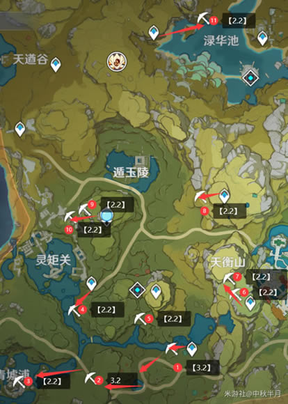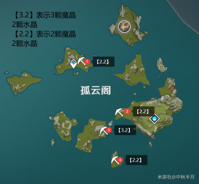 原神1.1版魔晶矿刷新机制及采集点详解 关于魔晶矿,每处魔晶矿附近会伴生2个水晶矿(有人是3个水晶,应该是之前单矿水晶没挖),刷新机制本人猜测为每天凌晨4点以后,且距离上次挖完魔晶12小时以上。 本人统计了几天的魔晶点位,发现蒙德地区每天会随机刷新6个魔晶矿矿点,璃月每天刷新10个矿点,只需要找各个地区的铁匠,他就会给你标出3-4个。 以下图中【3.2】表示3个魔晶2个水晶,【2.2】表示2个魔晶2个水晶; 蒙德地区魔晶矿分为两大区域:奔狼领和风龙废墟。 璃月地区分为两大矿区加上一个单独矿区,以绿华池为界分为两大矿区:庆云顶矿区和天衡山矿区,孤云阁单独划分为一个矿区。一般情况下璃月魔晶矿刷新为1个大矿区加上孤云阁矿区。 温馨提示:要去挖魔晶矿水晶矿之前最好去趟铁匠铺,这样可以看出自己今天的魔晶刷在了哪个矿区。