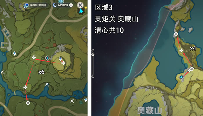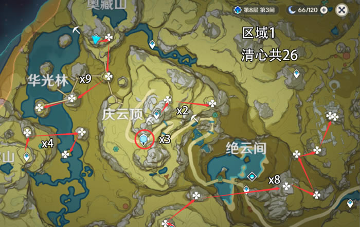 清心3个区域共52 刷新时间:48小时 用途 角色突破:大概率是魈的突破材料 推荐地区1华光林x9、x4路线和庆云顶园圈点 区域1 清心x26