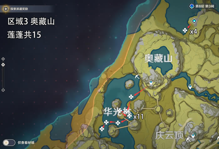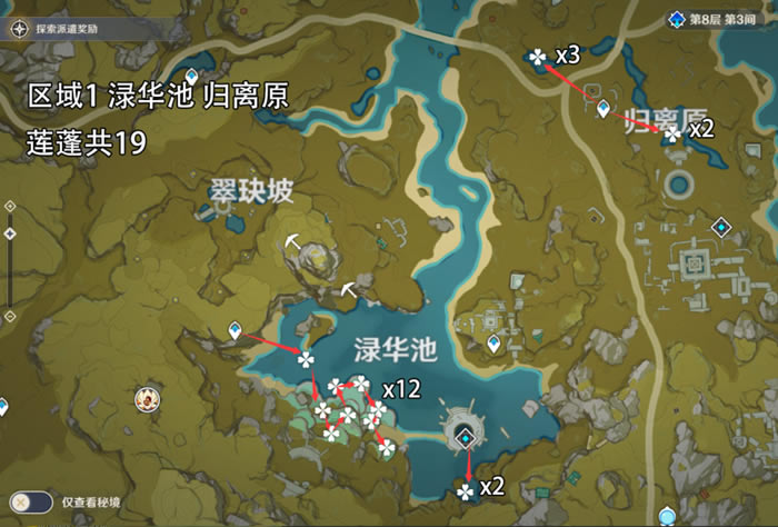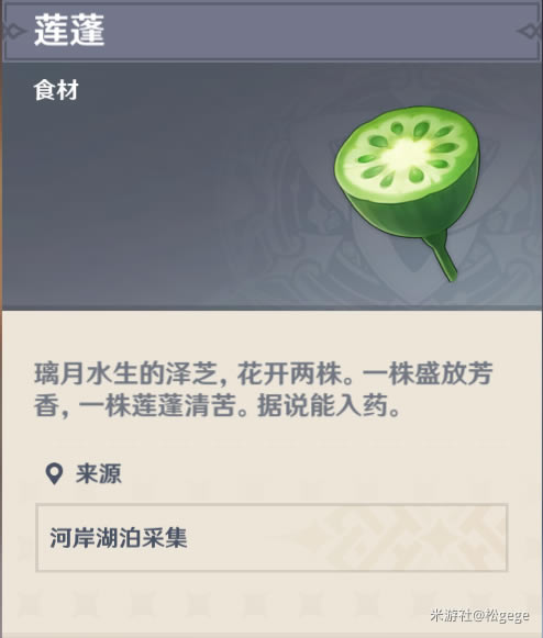 莲蓬3个区域x43 刷新时间:48小时 用途 食材烹饪: 翡玉什锦袋、轻策农家菜、珍珠翡翠白玉汤等… 合成药剂:防潮药剂、激流药剂 区域1 渌华池 归离原 莲蓬x19