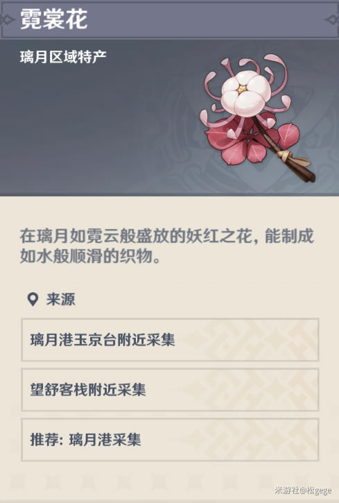 霓裳花2个区域共28 刷新时间:48小时 用途:行秋突破 望舒客栈 霓裳花共14