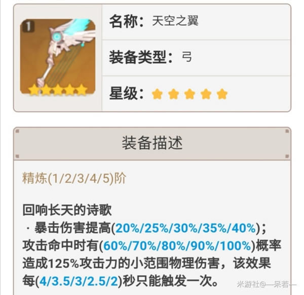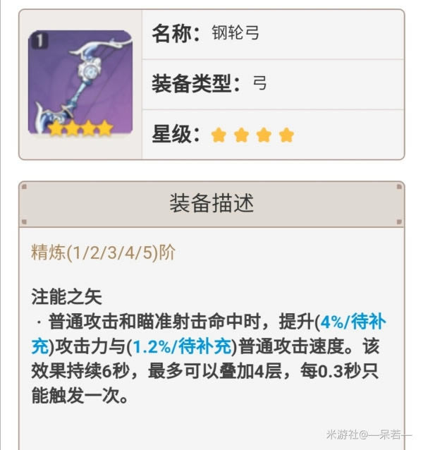 四星锻造武器钢轮弓,副属性是少见的物理伤害加成,技能有少见的攻速加成,虽然数值低但手感很好(比如重云的e)非常契合物理流,而且锻造武器成本低,很不错的武器。
