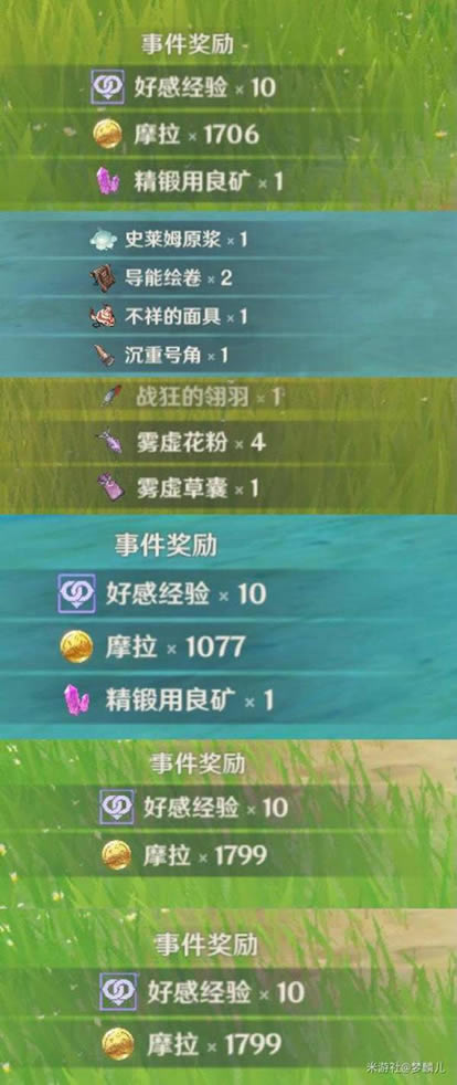 开篇科普 1、触发成功率仅与玩家下线位置有关,与其它无关 2、本攻略提供的点位材料掉落概率皆以50次测试为例。 3、原理猜测:以委托点为圆心,某个定长为半径的圆环,圆环上任何位置重登皆可触发(本攻略考虑实用性,挑选具有标志性地标且地势较高位置推荐,以方便玩家使用)。 4、“紧急委托”成功触发概率:97%(以100次测试为例,非绝对概率) 5、“紧急委托”每天前十次有额外事件奖励,超过十次收益与同世界等级其他怪相当 6、推荐图中星号代表委托刷新点,箭头号代表推荐角色占位 7、事件奖励(每次):; 摩拉1000~2000 魔矿 好感度 常规奖励: 对应怪物材料 圣遗物(概率获取,概率数据下文提供) 奖励示例: