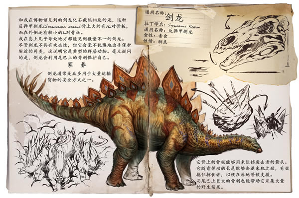 方舟生存进化TLC3生物图鉴更新分享 反弹甲剑龙(Stegosaurus regium) 词源:Stegosaurus,意为屋脊蜥蜴,指背上的剑板可能如同屋脊般排列,国内根据尾部似剑的骨刺译为剑龙属; Regium,意为具有反弹功能的,指游戏中剑龙能够抵御伤害的剑板。据此拟定译名为:反弹甲剑龙。 中文通称:剑龙 拉丁学名:Stegosaurus regium 正式名称:反弹甲剑龙 食性:植食 性情:驯良 野生:和我在博物馆见到的剑龙化石截然相反的是,这种反弹甲剑龙(Stegosaurus regium)背上大约有16对剑板,而在外侧还有较小的6对剑板。 我几乎能在岛上每个角落都见到数量不一的剑龙。 毫无疑问的是,剑龙会利用尾巴上的骨刺保护自己。尽管剑龙不具有攻击性,但它会毫不犹豫地出手保 附近的同类,这说明它是典型的群居动物。 家养:通常情况下,剑龙算是众多用于安全运输货物的载具之一。一旦为其配鞍,即便是一只阿根廷鹫也无法将你抓离。 驯化后的剑龙可以通过调节剑板应对多种需求和情况:硬化剑板-以应对来犯之敌;增加配重,朝两侧摊平-造成致命的伤害;亦或者更有利地刺穿敌手的护甲。 通过不同的调节方式,这些剑板也有便于剥落木材,收集茅草或采集野果。 剑龙的锥形骨刺既可用于鞭打或刺穿,击退或将捕食者固定在安全距离内,对采集野果也具有相当大的帮助。 TLC版