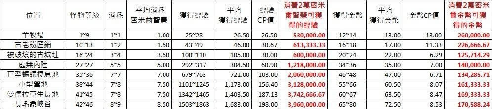 从上面的数据可以看得出来一样是花费两万密米尔的智慧 击杀越高等的怪物获得的经验越多但金币却越少 这就是为什么大部分人前期都不缺密米尔的智慧也不太缺钱 后期练的越高等却越来越穷(缺金币)的原因 本来还以为是金币都花在技能书上了~所以变穷了~ 但这样想不太对~ 你技能书都买了为什么还会越来越缺钱? 不应该是负成长 事实是你的支出没变收入却越来越少 或者也可以说金币变少经验变多了 (这样有比较宽心一点吗XD?) 密米尔泉水在各类型商店里面贩售的金额