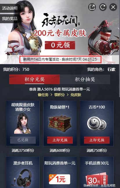 永劫无间胡桃清雅少女皮肤获取方法介绍 先看一下CC语音的活动时间 是个人14天 但是整体长期的新人礼活动