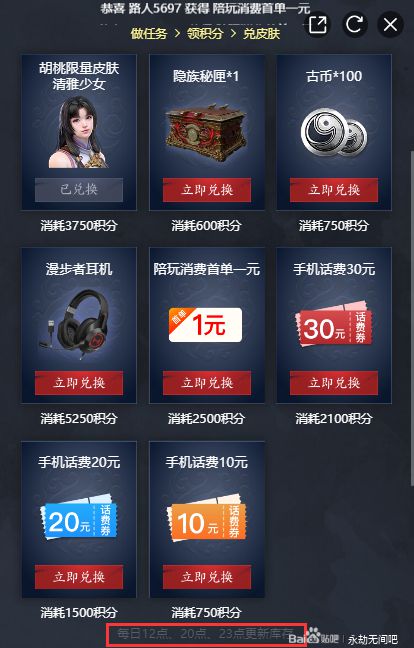 积分够了之后就是抢皮肤环节了 看一下官方给的出的更新库存的时间 12点、20点、23点 但是实测不是准点(后续会说明) 这个问题也已经上报了 不知道什么时候才能修复
