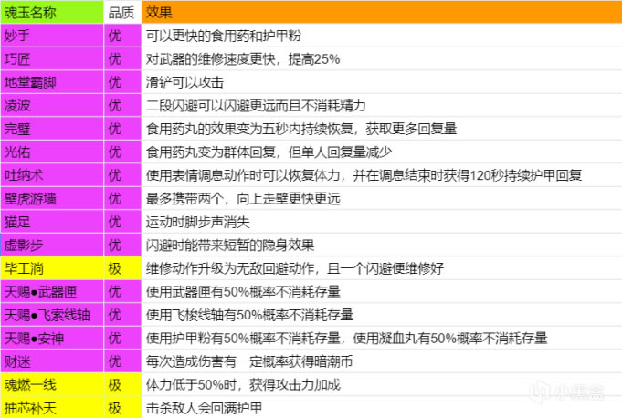 在道具魂玉中,毕工淌能将我们维修武器时的动作改变为闪避动作,而且不会消耗精力,而且能够在一个翻滚间就将武器维修好,这是个很实用的魂玉,在战斗时武器损坏,这无疑给了我们一个安全的维修环境,优先级为1。 妙手可以让我们更快的食用凝血丸和护甲粉,为复杂的战局添加了一点容错率,优先级为2。 巧匠可以将武器的维修速度提升25%,虽然也不错但比毕工淌差远了,优先级为2。 完壁,食用凝血丸的效果改为五秒内持续回复,回复量也会有所增加,但药很多时候都用不完,优先级为3。 光佑,食用凝血丸变为群体回复,但对单体的回复量会减少,虽然看起来不错,但无疑也会变成一个挨打对象,战斗中有这个功夫,不如去杀敌,优先级为2。 天赐-武器匣,使用武器匣有50%概率不消耗存量。 天赐-飞梭线轴,使用飞梭线轴有50%概率不消耗存量。 天赐-安神,使用凝血丸和护甲粉有50%概率不消耗存量,这三种平时数量不会少,所以并不怎么使用,优先级为3。 财迷,每一次对敌人造成伤害都会有一定概率获得暗潮币,打死了自然都是你的,优先级为3。