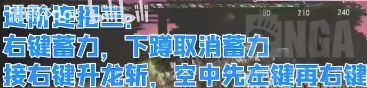 第二套连招操作为:“起手右键蓄力shift闪避接下蹲滑铲,然后右键使用升龙斩,然后下劈,之后可以预判对方的翻滚方向,再shift再接右键蓄力” (这一套特别适合打那些喜欢振刀的玩家,第一个蓄力一旦命中,如果对方振刀,因为你变招为了升龙斩,所以不会受影响,反而会让对方再吃一招,而敌人落地后因为倒地状态,无法使用振刀,所以只要翻滚方向正确,第二个蓄力也几乎不会被振刀)