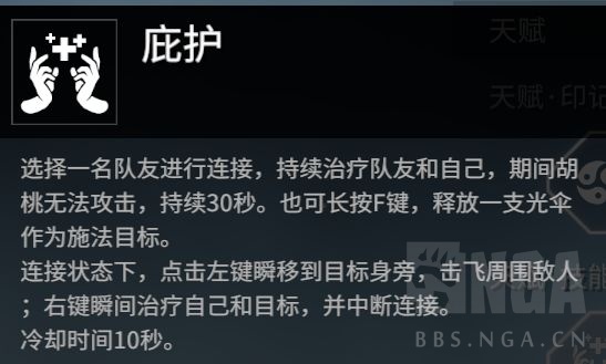 F键选中队友后释放,会让胡桃和队友之间连上一根光线,在牵引效果内时,胡桃和队友会逐渐的缓慢回血, 这一点基本就是守望先锋的天使或者DOTA2的小精灵。若附近无队友,或者长按F,会在地上放置一把光伞,胡桃将与光伞牵线。 在牵线状态下,胡桃是无法攻击的,请务必注意。 在牵线状态下左键,胡桃会位移到队友身边,右键则是会给队友一次强治疗效果。释放后结束牵线效果。 而大招若未点出第三个天赋,是在地上放置一个回复的光圈,不论敌我都在圈内回血/回甲,只有第三个天赋是瞬间抬血+抬甲。