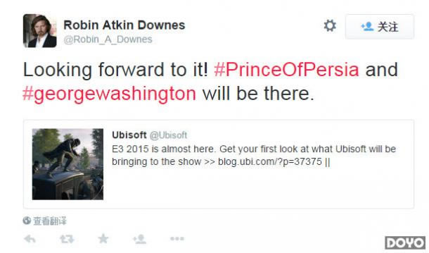 Robin Atkin Downes曾经为《波斯王子:武者之心》担当过波斯王子的配音,同时他也为许多其他游戏角色配过音,是一位业界著名的配音演员。在推文中,Robin Atkin Downes直接了当地表示《波斯王子》将会出现在2015E3会展的育碧发布会!虽然没有透露更多消息,但相信这已经足够让《波斯王子》游戏的粉丝们兴奋了。