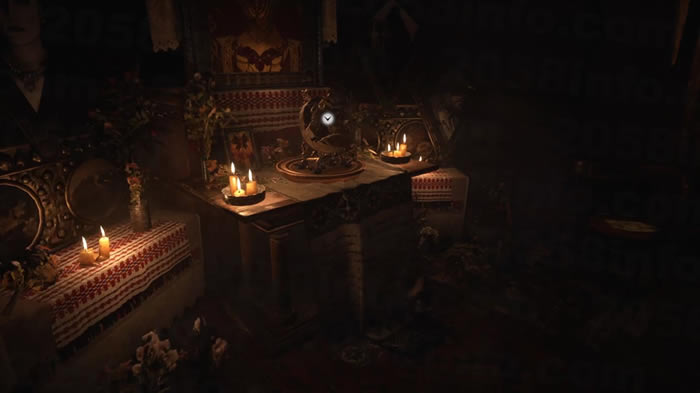 接著进入教会,在诡异的祭坛桌上可以取得关键道具少女头像;同一地点的正上方天花板也嵌著著一颗结晶碎片。