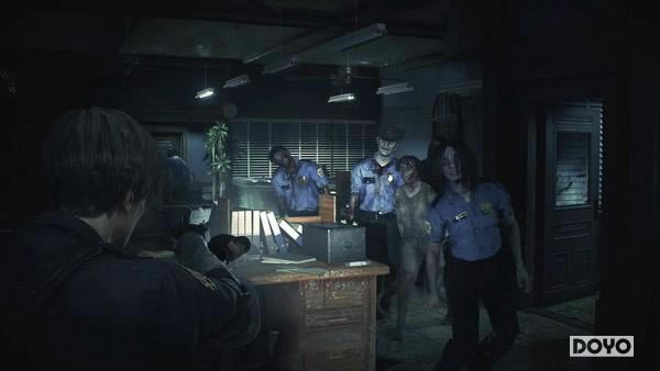2.别开枪,开枪就是打腿 对于《生化危机》里的丧尸们来说,“头铁”绝对是他们的代名词,一颗子弹击中了丧尸的头部可能会导致它们直接倒在地上,但这并不会杀死他们,对于汉克来说,也不容许他去做仔细瞄准和开枪补杀等等浪费时间的事情。 所以需要做的是就是一件事,让它们失去行动能力,而不是彻底杀死。 比如像是在办公室这样的小房间,活动有限,丧尸密集,那么你只需要在它们的膝盖上开上几枪,就足以保证你能基本毫发无损的溜出去。 这是阻止大量丧尸靠近的最好办法,但是如果你在这里面磨蹭得太久,它们可能也会试图来修你的脚,所以要节省时间,注意裆下。