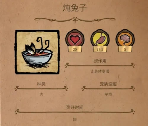 手持武器,伤害51,带80%减伤,耐久315 评价:好用,但也不好用,如果你能保证自己不受伤它就是可以能用315次的触手棍,如果挨打了就结算减伤扣耐久,up对这个武器的强度持保留态度,但至少这是官方出的一种全新的武器类型 接下来是两个没什么用的料理 炖兔子:【一肉三冰的没落】 炖兔子
