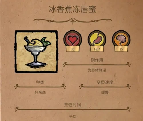 冰香蕉冻唇蜜 食材要求:必须有香蕉,必须有冰块,不能有树枝【放树枝会变香蕉冰】 推荐食谱:1香蕉+3冰 评价:吃一个这个能回30血15san,但吃一个香蕉冰能回20血33san,用18点回san换10点回血是否值得有待商榷 本次分享游戏《饥荒联机版》攻略。 |