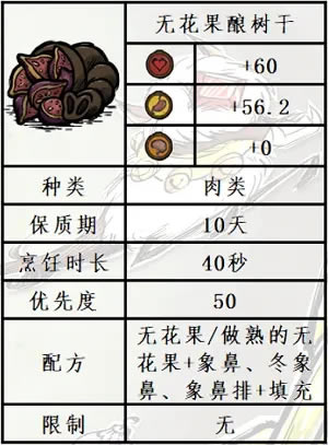 无花果可入锅,有四种烹饪食品,分别是无花果酿树干、无花果烤串、无花果意面、无花果蛙腿三明治。其属性如下: 1.无花果酿树干:本次更新后象鼻/冬象鼻也可以入锅,为具有1肉度的烹饪原料。