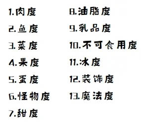 食物度 只有具有食物度的食物才能入锅烹饪,否则不能。比如击杀大象掉落的象鼻,分类上归属于肉类,但是不具有食物度,所以不能放进烹饪锅里。而击杀电羊掉落的电羊角,具有不可食用度,可以入锅作为料理的关键物或者填充。下面是具有食物度的物品汇总:
