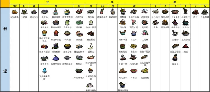 食物度 其中需要注意的是: ①除了鳗鱼以外,其他鱼肉的鱼度和肉度都是1:1。鳗鱼则是鱼度1,肉度0.5。 ②有四种活的生物具有食物度分别是:鼹鼠0.5肉度,龙虾1肉度、1鱼度,玉米鳕鱼、爆米花鱼1菜度。 ③只有活龙虾具有食物度,死龙虾和烤龙虾不具有食物度,不能入锅。 ④玉米鳕鱼和爆米花鱼在设定上相当于“玉米”和“爆米花”,因此具有1菜度。 二、优先度 优先度是烹饪料理具有的属性,其作用是:当两种或多种料理配方相同时,用烹饪锅烹饪,优先度最高的那个,会是最终产物,如果优先度相同,则最终产物按相同概率随机产生。 目前饥荒联机版所有料理中,优先度最高的是琥珀美食,优先度100,核心原料尘土块,也就是说,只要你在烹饪锅中放入1个尘土块,其它三个填充物不论你放什么,最后烹饪锅的产物都是琥珀美食。 而优先度最低的是肉丸,优先度-1,需要肉度和填充,限制物为小树枝。因此,3大肉+1填充虽然符合肉丸的配方,但肉汤优先度高,烹饪锅产物是肉汤;其它诸如波兰水饺、蜜汁卤肉、蜜汁火腿等肉类料理都是如此。下面是料理的优先度展示: