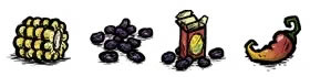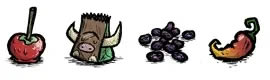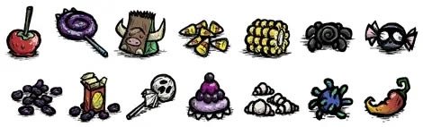 图片中的糖果按顺序从左到右,从上到下,分别是:糖果苹果、触须棒棒糖、巧克力猪、糖果玉米、不太甜的玉米、粘液蜘蛛、浣猫糖果、“葡萄干”、葡萄干、鬼魂棒棒糖、果冻虫、无敌硬糖、糖果虱、熔岩椒。 猪人: 猪人可以食用全部的糖果,可以主动食用地上的,或者人物喂食。但只有在吃掉不太甜的玉米、“葡萄干”、葡萄干、熔岩椒后会掉落一个粪便,而且不能连续食用。