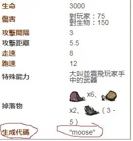 鹿鹅生成代码 比如鹿鹅,物体名称就是"moose",所以想要删除10码内的鹿鹅的话指令就是: c_findnext("moose",10):Remove() 另一方面有一些物体的生成代码和实体名称是不一样的。比如树桩的生成指令是“stump_evergreen”,但是删除树桩时依然要用常青树的指令"evergreen": c_findnext("evergreen",10):Remove() 同时,不可互动的物体也可以通过这个指令删除,比如删除鹿鹅巢: c_findnext("moose_nesting_ground",10):Remove() 联机版中的洞穴入口出口也可以删除。比如删除总是刷蝙蝠的基地边上的入口: 入口: c_findnext("cave_entrance_open",10):Remove() 或: c_findnext("cave_entrance",10):Remove() 出口: c_findnext("cave_exit",10):Remove() 删除之后可以使用c_spawn生成指令产生一个新入口/新出口,否则人物进出洞穴时就会从地面/洞穴的传送门里而不是对应的入口/出口出来。 10码的距离到底多远 之前做了个试验看10码距离大概多少: 用花瓣标记了树枝的位置,然后一边靠近一边输入c_findnext("sapling",10):Remove()