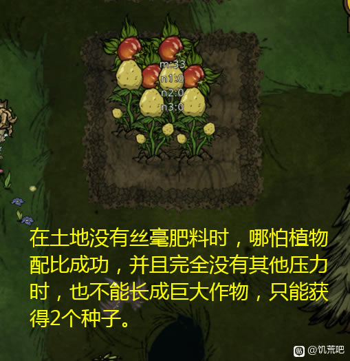1.留1个种子懒人法 要保留1个种子,最大压力值是11 那么我们只要考虑这些条件就好了。 对应季节,没有杂草杂物,最少4个作物挨着一起种植。 然后剩下浇水,施肥,音乐,对应4个阶段,就是3?4=12压力,这肯定不行啊 那么我们种下种子的时候顺便摸一下代替一次音乐,压力值就变成11了!! 恰好满足留种的最低要求!! 是不是很方便!种下之后摸一下,然后浇水,施肥,音乐什么都不用管了。坐等3天后收获,再种 2.留2个种子懒人大法 要保留2个种子,压力是最大为6 按照上面的做法肯定不行,那么在此基础上,我们要将植物按照对应的比例搭配来种植! 这样压力值就只从浇水,星月上得了,此时剩余2?4=8点 按照搭配种下种子之后,摸一下,再把水浇满。就减少了2点压力了 此时压力=8-2=6点!! 之后就不管了,坐等3天后额外获得2个种子!!! 说个小发现。 如图,不是说只要植物搭配得当,就可以完全不用管土地的肥料含量怎么样了! 土地里面至少还要有1个箭头的肥料才行8%