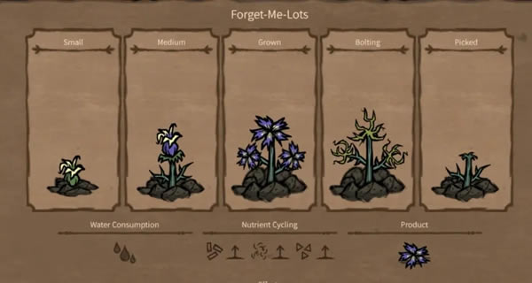 with their pleasant,relaxing scent it's often difficult to remember they 're weeds-W 作为杂草四天王之一的勿忘我,可以如果,属性仅仅为勿忘我,因此不会和任何食谱冲突,由于其两天一开花甚至冬天也能开花的特性可以轻松存下大量的勿忘我,缺食物?胡萝卜加3勿忘我就是炒蔬菜,而且就算你不特意种植它也会出现在你的菜园里,你就算专门开垦一片菜地来种植勿忘我也不会亏的(虽然须有有人照看防止没来得及摘取导致的勿忘我枯萎)!但是勿忘我的植株落果枯萎很快,成熟一天之后就会枯萎,枯萎之后就要挖掉,因为枯萎的勿忘我是不会生长也不会开花的XWX 勿忘我还可以配合蜂蜜和冰块做一杯勿忘我茶(自译)恢复3血,15san,0饥饿