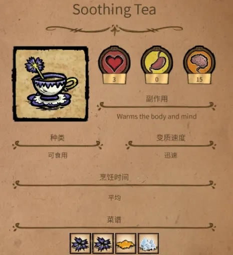 Soothing Tea 特殊效果是会附加一个持续恢复san的状态,会持续恢复30点,加上喝下时恢复的15点,总共45点,只比冰淇淋少5点,唯一问题是勿忘我和这个茶的新鲜度都很低,只有3天,所以尽可能现做现喝吧。。。 接下来是小糖豆,犁草(机翻),直接食用恢复1血量
