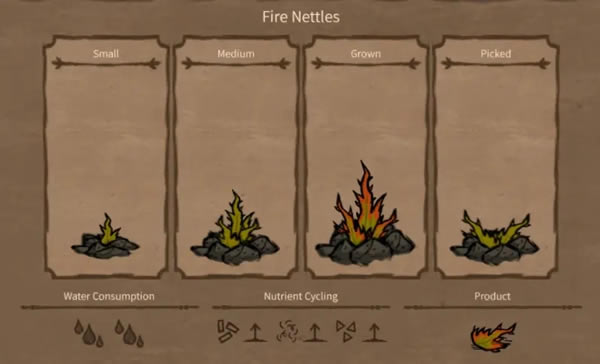 tillweeds salve 使用后恢复8点血量,然后缓慢恢复到20点,总共28点,是目前最低也是最好弄的持续回血药物,但是犁草生长需要四天,虽然和勿忘我一样是四季节都能生长,但是获取速度相对于勿忘我更慢一些,所以不建议专门种植,当然,植物人除外(植物人空手种过的地面上的坑也有可能长出杂草) 接下来是一种很奇特的杂草,名为火荨麻,食用后-5san,-20血