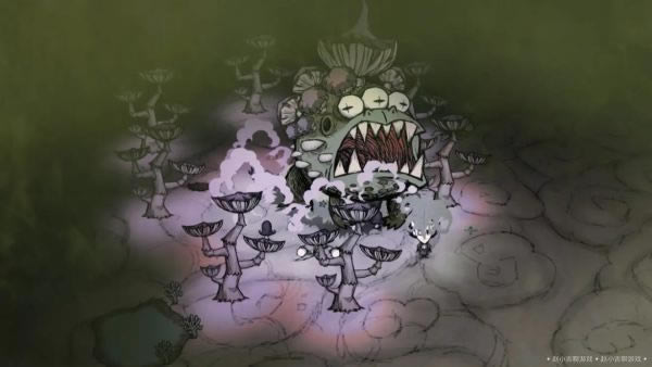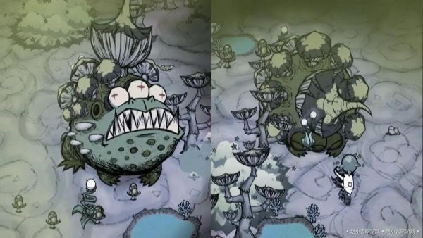 战斗机制: 蟾蜍每隔一段时间会开始召唤孢子菇(要用斧头砍),孢子菇每存在4棵会使蟾蜍升级一个阶段,上限16棵,升级会提升攻击力、攻击距离、炸弹数量、防御力、行走速度。