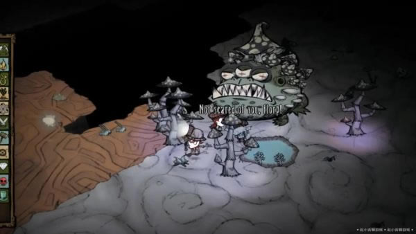 攻击模式: 炸弹蘑菇 抛出一圈蘑菇炸弹在地上,几秒后爆炸造成范围攻击,炸弹数量、伤害都取决于蟾蜍的孢子菇数量。 蘑菇孢子 放置孢子在玩家头上,几秒后散成一团滞留在地上,站在滞留孢子里会持续受伤,头上的孢子和滞留孢子都会使身上食物的保鲜值迅速下降。 震地 跳起来震地,范围伤害,同时还会引起地底地震。